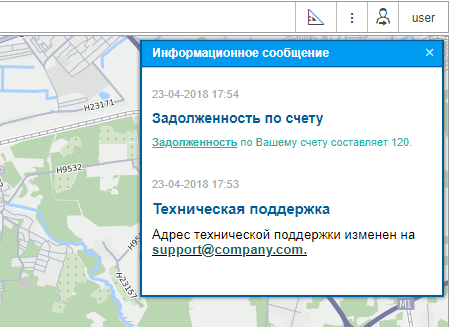 В верхней панели под именем пользователя могут показываться информационные сообщения от менеджера сервиса и уведомления о количестве дней, оставшихся до отключения от системы мониторинга (если таковое предусмотрено тарифным соглашением).