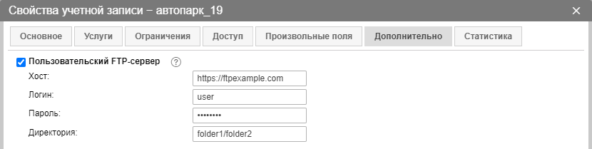 Чтобы использовать FTP-сервер, на вкладке Дополнительно необходимо включить опцию Пользовательский FTP-сервер и указать для него хост, логин, пароль и директорию, в которой будут храниться файлы или архивы.