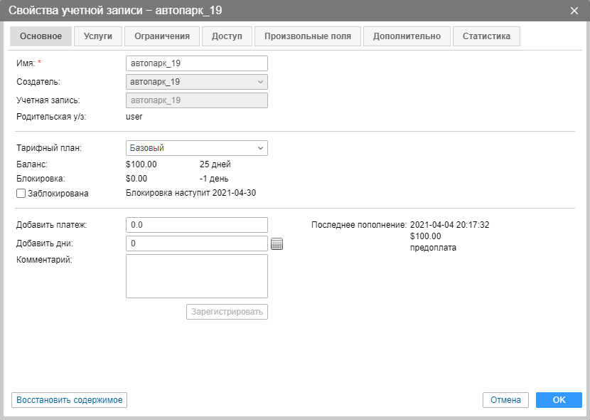 Строка Баланс показывает текущий денежный баланс учетной записи, а также остаток дней (если опция блокировки по дням включена для данной учетной записи на вкладке Ограничения). Строкой ниже указываются лимиты, при которых должна происходить блокировка учетной записи. Здесь эти лимиты просто напоминаются, а редактируются также на вкладке Ограничения.