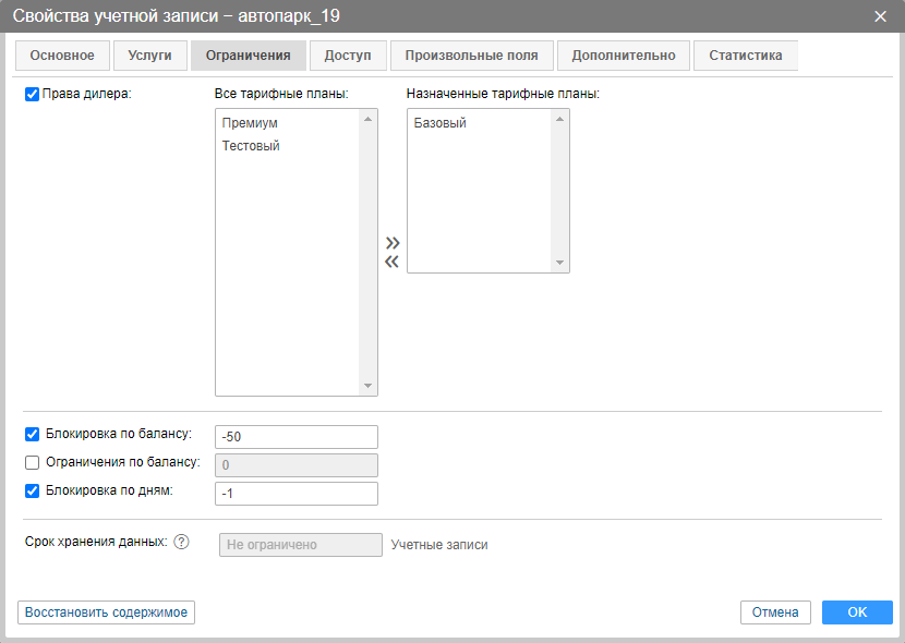 Следующие три опции связаны с ограничением активности пользователей в случае неуплаты. Как правило, в них задается либо значение 0, либо отрицательное значение, чтобы дать возможность клиентам использовать систему спутникового мониторинга еще некоторое время после истечения баланса или дней. Если данные опции не активированы, то будут подхватываться ограничения из тарифного плана или родительской учетной записи.
