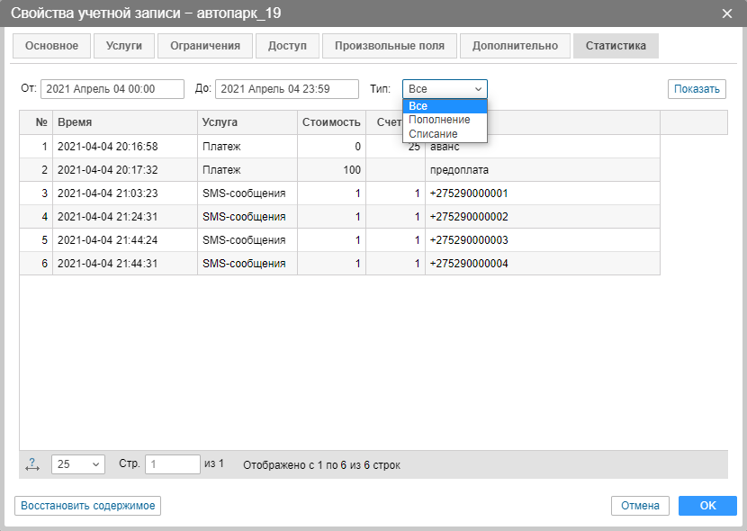 На вкладке Статистика можно посмотреть поступления и списания с баланса за заданный период времени. Укажите временной интервал и нажмите Показать. Все зарегистрированные пополнения и списания будут выведены в таблицу. Кроме того, пополнения списания можно отделить друг от друга при помощи фильтра. Однако после выбора типа статистики нужно повторно нажать кнопку Показать.