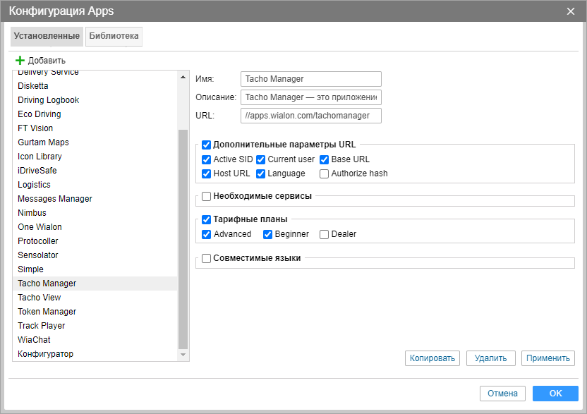 Добавлять приложения может только пользователь верхнего уровня. Для этого в меню пользователя предусмотрен специальный пункт — Конфигурация Apps. Выбрав данный пункт меню, вы откроете диалоговое окно, которое содержит две вкладки — Установленные и Библиотека. Эти вкладки дают возможность ознакомиться со всеми доступными приложениями, а также сконфигурировать и добавить новые.