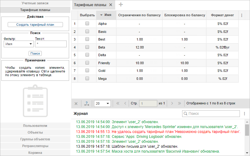 Создавать тарифные планы и управлять ими может только пользователь верхнего уровня.
