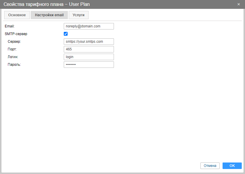 Для того чтобы при отправке системных сообщений использовался ваш SMTP-сервер, введите адрес электронной почты и активируйте опцию SMTP-сервер. Далее укажите сервер, порт, логин и пароль. Убедитесь, что в адресе сервера указан протокол: smtp или smtps. Как правило, для smtp используются порты 25 и 587, для smtps — 465.