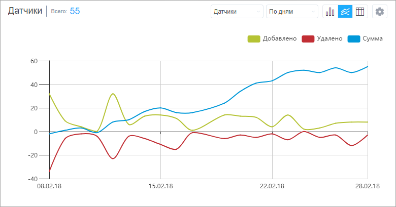 В настройках этого графика в выпадающем меню Показывать данные по можно выбрать тип данных, которые будут отображены в графике. Доступные варианты описаны ниже.