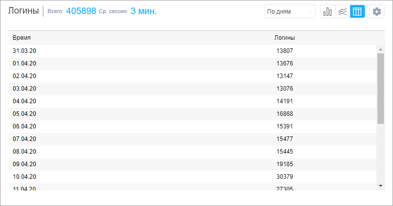 Данные графика могут быть представлены в виде гистограммы, линейной диаграммы или таблицы и сгруппированы по дням/неделям/месяцам/кварталам.