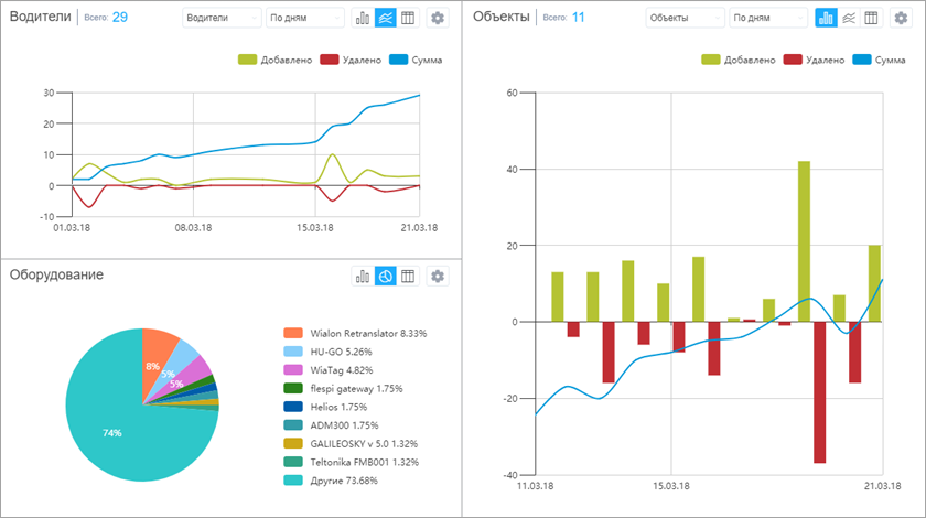 Данный блок содержит информацию о добавленных или удаленных объектах с определенным типом оборудования. Данные графика по оборудованию могут быть представлены в виде гистограммы, круговой диаграммы или таблицы.