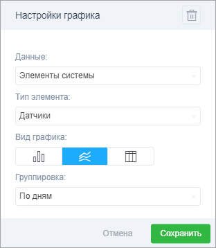 Если необходимо отредактировать график, нажмите на кнопку «шестеренка», расположенную в правом верхнем углу шапки. Произведите необходимые настройки в соответствии с типом данных и нажмите Сохранить.