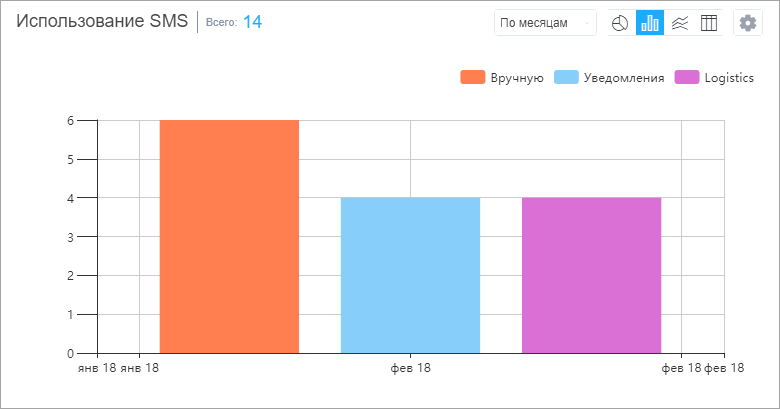 **Данные об общем расходе SMS могут быть представлены в виде гистограммы, линейчатой диаграммы или таблицы и сгруппированы по дням/неделям/месяцам/кварталам.