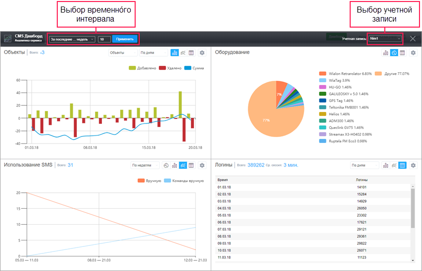 На странице Дашборд доступны графики по 4 типам данных: элементам системы, оборудованию, использованию SMS и логинам.