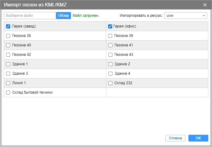 Укажите путь к файлу и нажмите Загрузить. После обработки будет выведено найденное в файле содержимое. Отметьте флагами необходимые элементы и выберите, в какой ресурс импортировать данные. В выпадающем списке показаны только те ресурсы, на которые есть доступ Создание, редактирование и удаление геозон.
