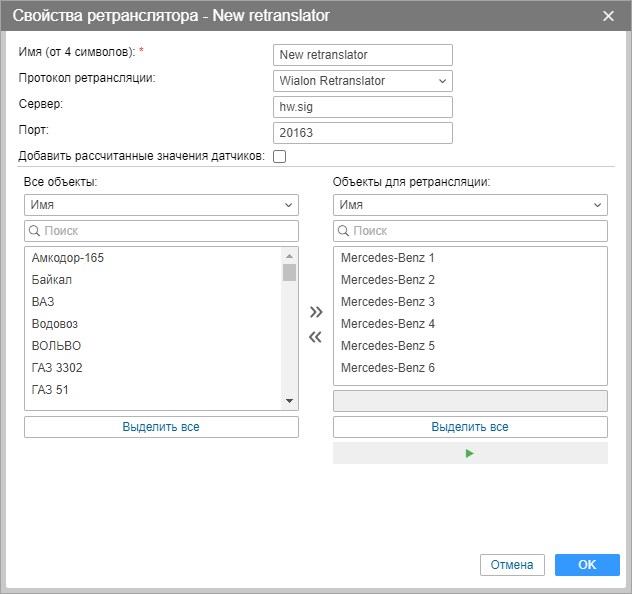 Ниже располагается список доступных объектов. Для удобства поиска можно воспользоваться динамическим фильтром. Работает данный фильтр не только по имени, но и по телефонному номеру, уникальному ID, типу устройства, произвольным полям и др. После того, как искомые объекты были найдены перенесите их в правый список двойным щелчком мыши либо при помощи кнопки Добавить (стрелочки вправо). К списку объектов для ретрансляции также может быть применен динамический фильтр (по имени, по переопределенному ID). Чтобы удалить объекты из списка ретрансляции, перенесите их из правого списка в левый при помощи кнопки Убрать (стрелочки влево). Кроме того, при выборе объектов для ретрансляции можно задать им новый ID. Для ретрансляции по протоколу Granit Navigator ID объекта должен быть числом от 0 до 65535.