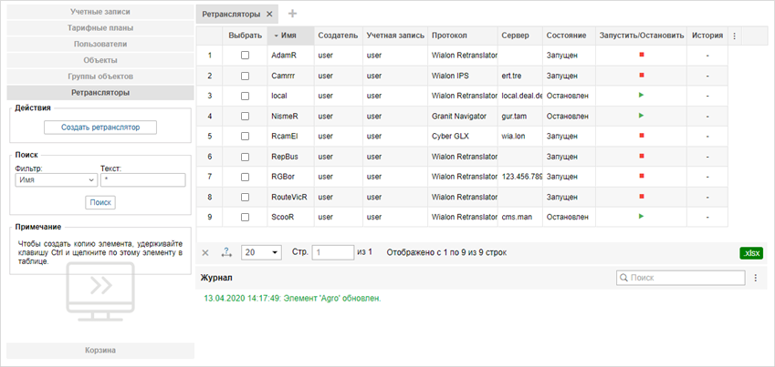 В таблице результатов отображается имя ретранслятора, создатель (им всегда является тот пользователь-менеджер, под чьим логином был создан ретранслятор), протокол, сервер, состояние, кнопки для запуска/приостановки ретрансляции и для удаления самих ретрансляторов, а также иконка открытия диалогового окна журнала. Щелкните по ретранслятору, чтобы просмотреть его свойства, добавить или убрать объекты, запустить или остановить ретранслятор, а также отредактировать или просмотреть другие его параметры.