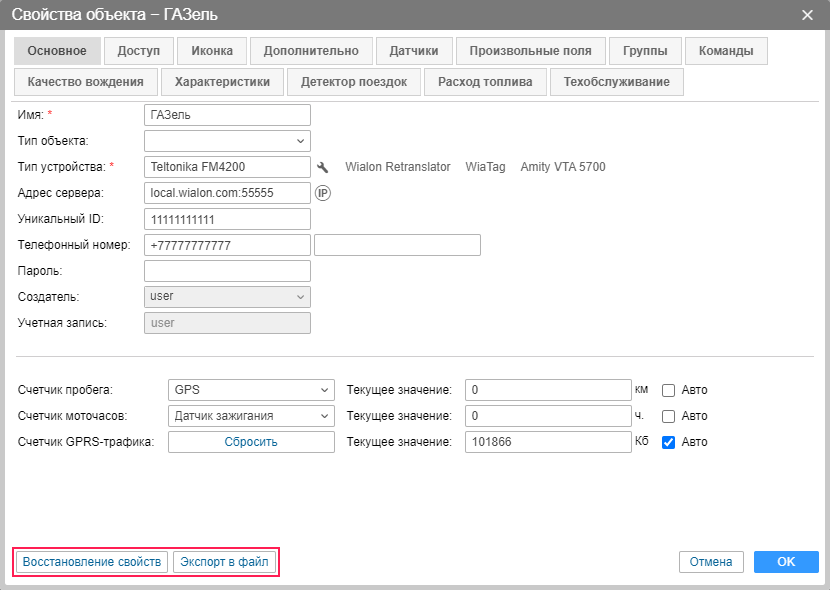 В системе Wialon предусмотрена возможность восстановления свойств объекта. Восстановление свойств может понадобиться, если по ошибке были отредактированы или удалены какие-то данные, содержащиеся в диалоге свойств объекта на любой из его вкладок. Для восстановления доступны свойства объекта, сохраненные за последние 14 дней.