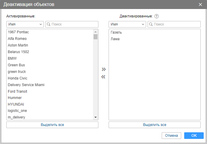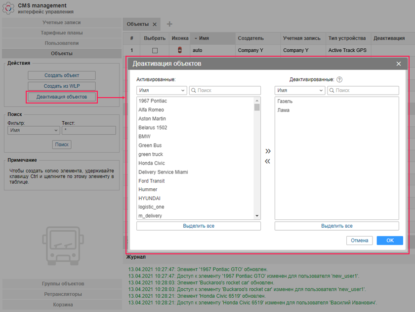 Для перемещения объектов из одного списка в другой воспользуйтесь кнопками-стрелками между ними или двойными щелчками левой кнопки мыши. По достижении лимита перенос объектов в список справа становится невозможным. Соответствующая запись с указанием имен объектов, которые не были деактивированы, появляется в журнале.
