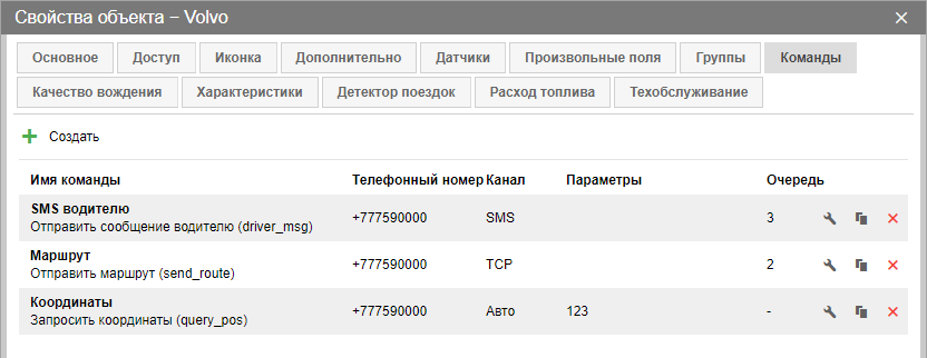 На вкладке Команды в свойствах объекта можно создавать и настраивать команды для последующей отправки объекту. Команда может отправляться вручную со вкладки Мониторинг или автоматически через задания и уведомления. Чтобы по заданию или уведомлению команда выполнялась у нескольких объектов сразу, их команды должны иметь одинаковые имена.
