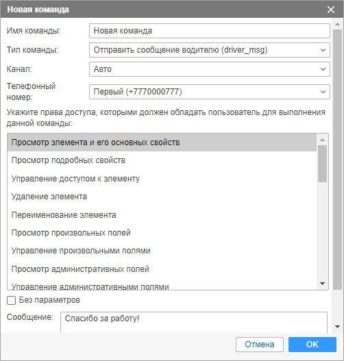 Для некоторых команд нужны дополнительные параметры. Это может быть, например, номер входа/выхода, интервал онлайн отчетов и т.д. Параметры можно указать при создании команды, и тогда они будут автоматически применяться при ее выполнении. На одну и ту же исходную команду можно создать несколько команд с разными параметрами выполнения и типами связи. Однако параметры при создании команды указывать не обязательно. Для этого включите опцию Без параметров. В таком случае параметры будет необходимо указать при отправке команды. Если тип связи и параметры установлены, то при отправке команды их нельзя изменить.