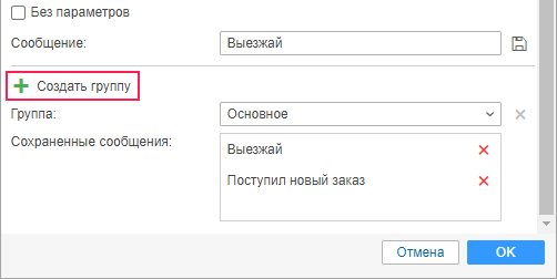 При создании команды Отправить произвольное сообщение можно создавать группы и добавлять в них сообщения. Это позволяет быстро найти необходимое сообщение при выполнении команды.