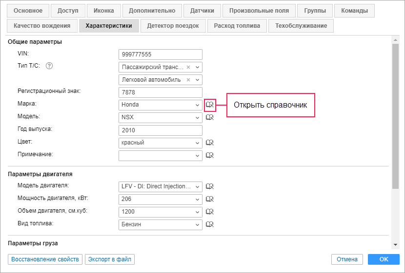 Остальные поля на вкладке по способу заполнения можно разделить на стандартные текстовые и комбинированные. К комбинированным относятся марка, модель, цвет, примечание, модель двигателя, мощность двигателя, объем двигателя, вид топлива, тип груза. С этими полями можно выполнять следующие действия: