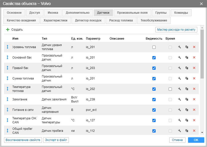 Флаг Видимость, который имеется напротив каждого датчика, регулирует отображение этого датчика в различных местах интерфейса. Отключение видимости может понадобиться для “промежуточных” датчиков, которые не имеют самостоятельного значения, а являются, например, валидаторами для других датчиков. Также некоторые датчики типа расхода топлива или импульсный датчик уровня топлива не несут большой информативности в числовом виде, а применяются преимущественно для графиков.