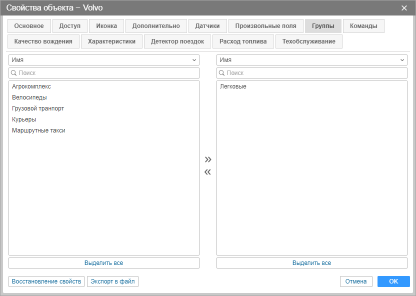 Слева дан список существующих групп, справа — только те группы, в которые входит этот объект. Используйте кнопки Добавить/Удалить, чтобы включить объект в группу или исключить его из нее.