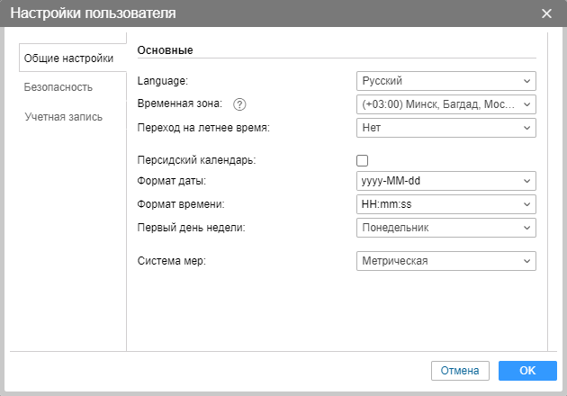 | Общие настройки | На этой вкладке можно указать свой часовой пояс, адрес электронной почты, изменить пароль, язык и др. |