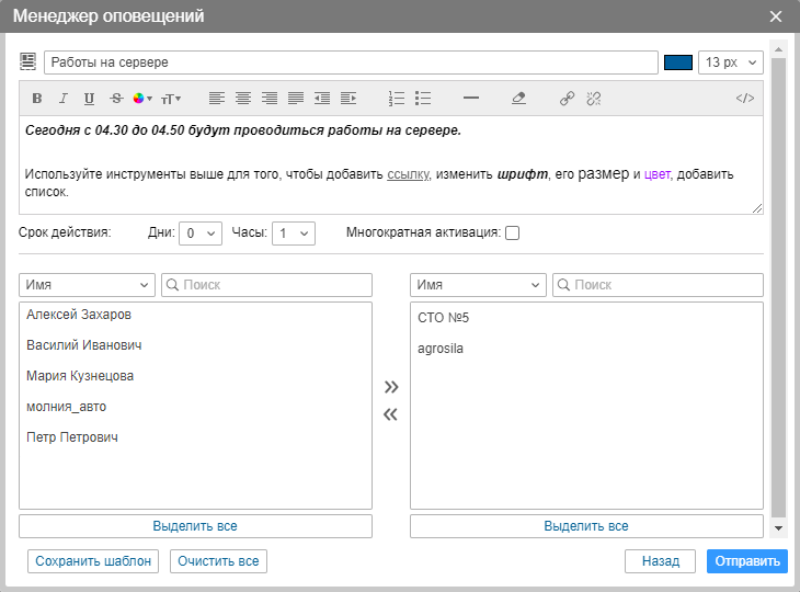 После того, как текст введен и отформатирован, установите срок действия оповещения (от 1 часа до 30 дней) и активируйте опцию Многократная активация, если необходимо, чтобы оно показывалось адресату при каждом его входе в систему в течение указанного срока действия. Если опция не активирована, оповещение будет показано только один раз (пока пользователь его не закроет).