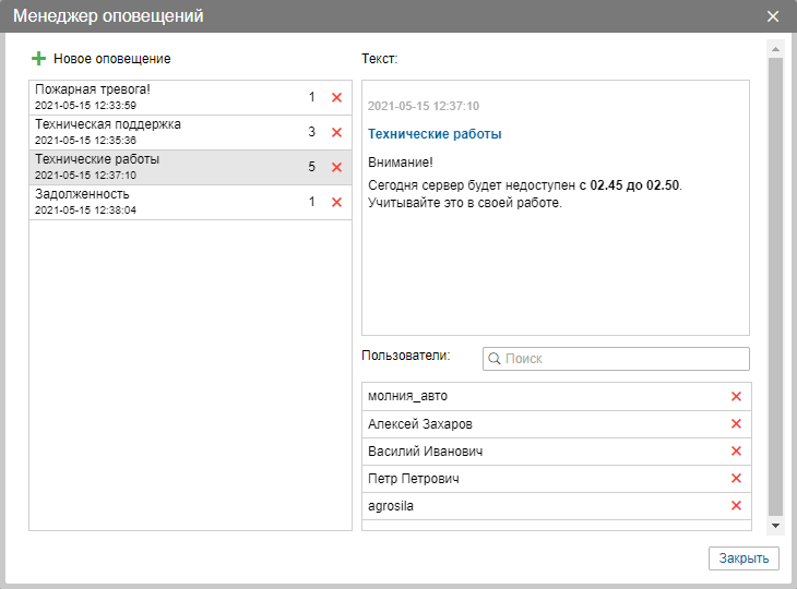 Под полем текста располагается список пользователей, которым было отправлено выбранное сообщение. Для быстрого поиска предусмотрен динамический поиск. Пользователей также можно удалять (оповещение перестанет показываться им) посредством нажатия на красный крест напротив их имени.