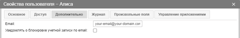 Если хотите получать уведомления о блокировке учетной записи на email адрес, указанный выше, активируйте опцию Уведомлять о блокировке учетной записи по email. Уведомления начинают приходить ежедневно за 5 дней до блокировки. Для работы с данной опцией необходимо активировать сервис Уведомления по email в свойствах учетной записи.