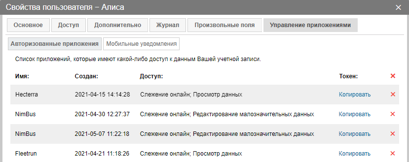 На данной вкладке представлен список приложений, которые могут отправлять уведомления на Ваши мобильные устройства. Слева располагается название приложения, справа — перечень устройств. Чтобы запретить приложению отправку мобильных уведомлений, необходимо удалить его из списка (красный крест в конце строки).