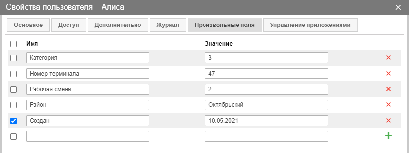 На данной вкладке можно добавить любую информацию о пользователе, будь то его домашний адрес или его рост. В левом поле введите название поля, в правом — его значение. Для сохранения пользовательского поля нажимайте кнопку Добавить, для удаления — Удалить. В конце редактирования диалога нажмите ОК в правом нижнем углу. При следующем открытии диалога, поля будут автоматически отсортированы по алфавиту. Часть полей можно пометить как административные (кнопка-флаг перед полем), т. е. они будут видны только пользователям с соответствующими правами.