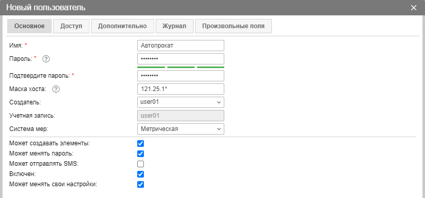 Свойства пользователя задаются при его создании, редактировании и копировании в специальном диалоге на нескольких вкладках. Доступность тех или иных вкладок и полей, а также возможные действия с ними зависят от уровня прав доступа. Вкладки Основное и Дополнительно доступны всегда. Некоторые настройки могут стать недоступными для редактирования также в том случае, если учетная запись пользователя заблокирована.