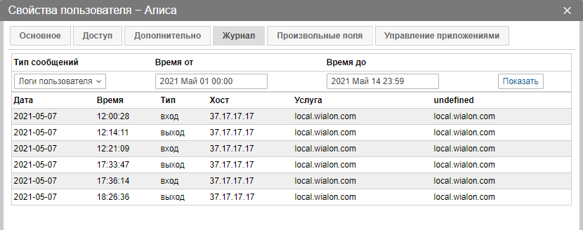 В журнале можно просмотреть, когда пользователь подключался к системе или выходил из нее, на какой сервис он заходил, с какого хоста. Укажите период времени и нажмите кнопку Показать.