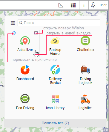 Приложение может быть открыто как в новой вкладке браузера, так и в отдельном окне поверх Wialon. Для того чтобы открыть приложение в новой вкладке, щелкните по его логотипу (названию). Если же его необходимо открыть поверх Wialon, используйте кнопку