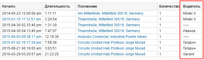 В таблицы большинства отчетов (Поездки, Моточасы, Заправки, Сливы, Превышения скорости и др.) можно добавить колонку с именем водителя. Оно показывается, если водитель был назначен на объект в выбранный интервал отчета.