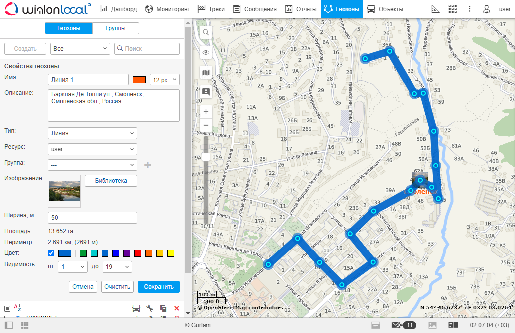 Геозона может быть выполнена в форме полигона (фигуры произвольной формы), линии или круга. При выборе линии или круга ниже появится дополнительное поле, в котором следует указать толщину для линии или радиус для круга.