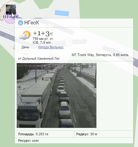 Кроме того, во всплывающей подсказке к геозонам можно получать динамически обновляющиеся изображения из других источников (видео с веб-камеры, фотографии, курсы валют, прогноз погоды и т. п.).