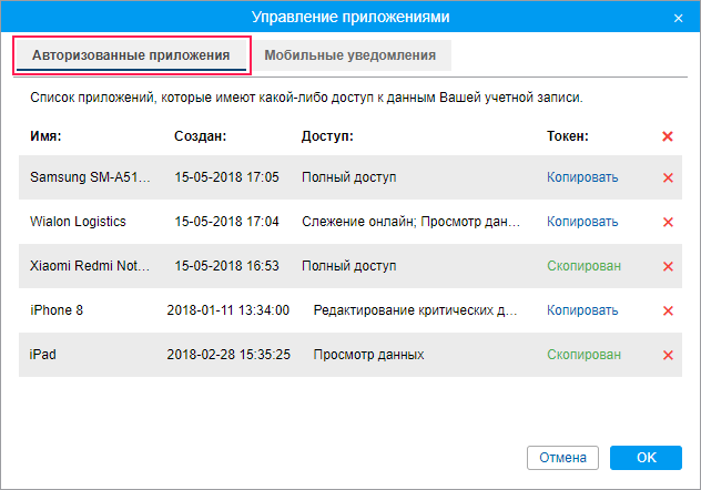 В окне Управление приложениями показывается список приложений, которые имеют доступ к вашей учетной записи, а также список устройств, которые могут принимать мобильные уведомления из Wialon. Эти списки формируются автоматически после входа в приложение.