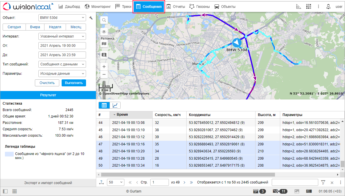 На вкладке Сообщения можно посмотреть все сообщения, полученные от объекта (координаты, параметры, скорость и т. п.), а также SMS-сообщения от объекта, команды, отправленные на объект, и зарегистрированные в истории объекта события, журнал объекта.