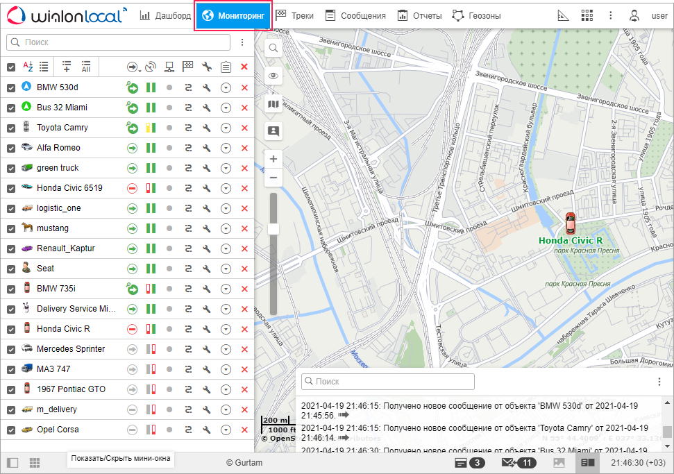 На вкладке Мониторинг доступны основные функции, связанные со слежением. Здесь можно наблюдать за передвижением объектов на карте, отправлять на них команды и сообщения, запрашивать фотографии и видео, отслеживать изменения различных параметров онлайн и т. д.