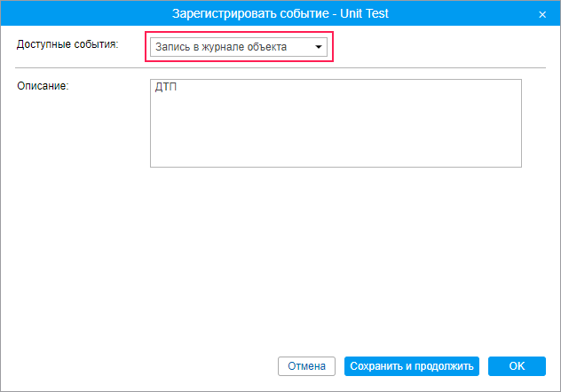 Заполните необходимые поля и нажмите ОК. Если для одного объекта необходимо зарегистрировать несколько событий, нажмите Сохранить и продолжить. Запись будет внесена в журнал (в левом нижнем углу диалога появится соответствующая надпись), после чего можно перейти к регистрации следующего события.