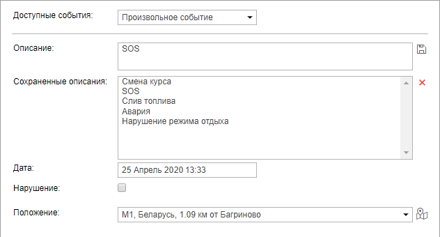 Для регистрации произвольного события введите его описание, дату и положение. Чтобы добавить местонахождение в поле Положение нажмите на иконку
