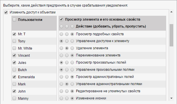 Выберите пользователей, чьи права должны быть изменены в определенных условиях, и укажите для них новый набор прав. Эта опция может быть использована, к примеру, в следующей ситуации. Предположим, вы создали пользователя, который следит за передвижением своего груза, то есть у него есть права на некоторые объекты (о которых и создается уведомление). После доставки груза в условленное место (то есть после входа в геозону), эти объекты автоматически становятся недоступными данному пользователю.