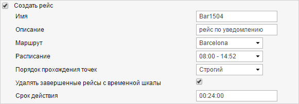 В качестве действия по срабатыванию уведомления можно назначить на объект новый рейс. Например, рейс может быть назначен при выходе из зоны (например, Гараж), либо по завершении одного рейса объект может быть автоматически поставлен на другой. Подробно параметры, которые могут быть настроены для маршрутов, описаны в разделе Маршруты.