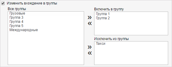 При срабатывании уведомления можно включить объект в группу или исключить из групп. Слева отображается список доступных групп. Оттуда они могут быть перенесены вправо — в список Включить в группу (чтобы после срабатывания уведомления объект был включен в указанные группы) либо Исключить из группы (чтобы после срабатывания уведомления объект был удален из указанных групп).