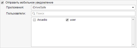 В данном случае при срабатывании уведомления пользователю/пользователям соответствующего приложения будет отправлено мобильное уведомление. В верхнем поле необходимо выбрать приложение. Далее системой проверяется наличие необходимых прав в отношении пользователей: Просмотр подробных свойств, Действовать от имени этого пользователя. Наличие данных прав проверяется как у текущего пользователя, так и у создателя ресурса, которому принадлежит уведомление. Затем на основании данной проверки ниже формируется список пользователей. Здесь вы можете указать одного/нескольких (отметив соответствующие флаги) или всех (удерживая Сtrl, выбрать любого из них) пользователей, которым будет отправлено мобильное уведомление. Для облегчения поиска пользователей можно воспользоваться динамическим поиском.