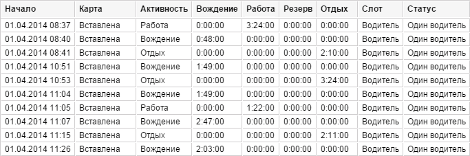| Активность | Вид действия водителя (вождение, отдых, работа, резерв, перерыв). |