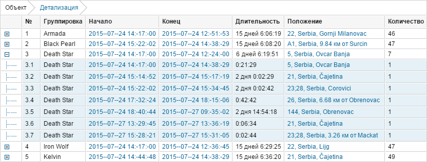 Ниже следует пример — таблица Стоянки для группы, состоящей из пяти объектов. Таблица дает следующие данные: начало первой стоянки, окончание последней стоянки, суммарная длительность всех стоянок, общее количество стоянок за отчетный интервал. При этом на каждый объект приходится одна строка таблицы.