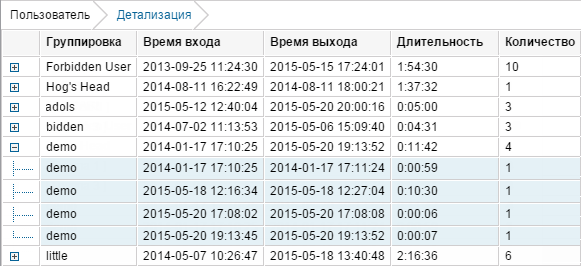 К данной таблице могут быть применены те же настройки, что и к прочим таблицам: группировка, детализация, нумерация строк, итоговая строка, ограничение по времени. Ниже приведен отчет по пользователям с применением группировки по дням, детализацией, нумерацией и строкой Итого.