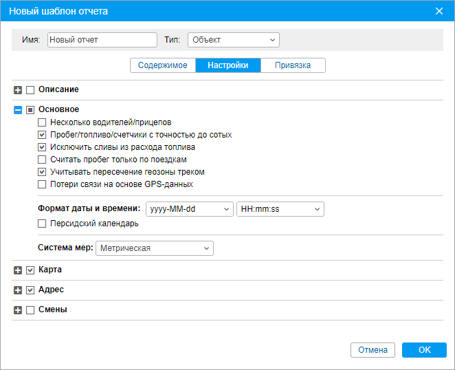 На вкладке Настройки диалога создания шаблона отчета, в зависимости от его типа, могут содержаться следующие разделы: